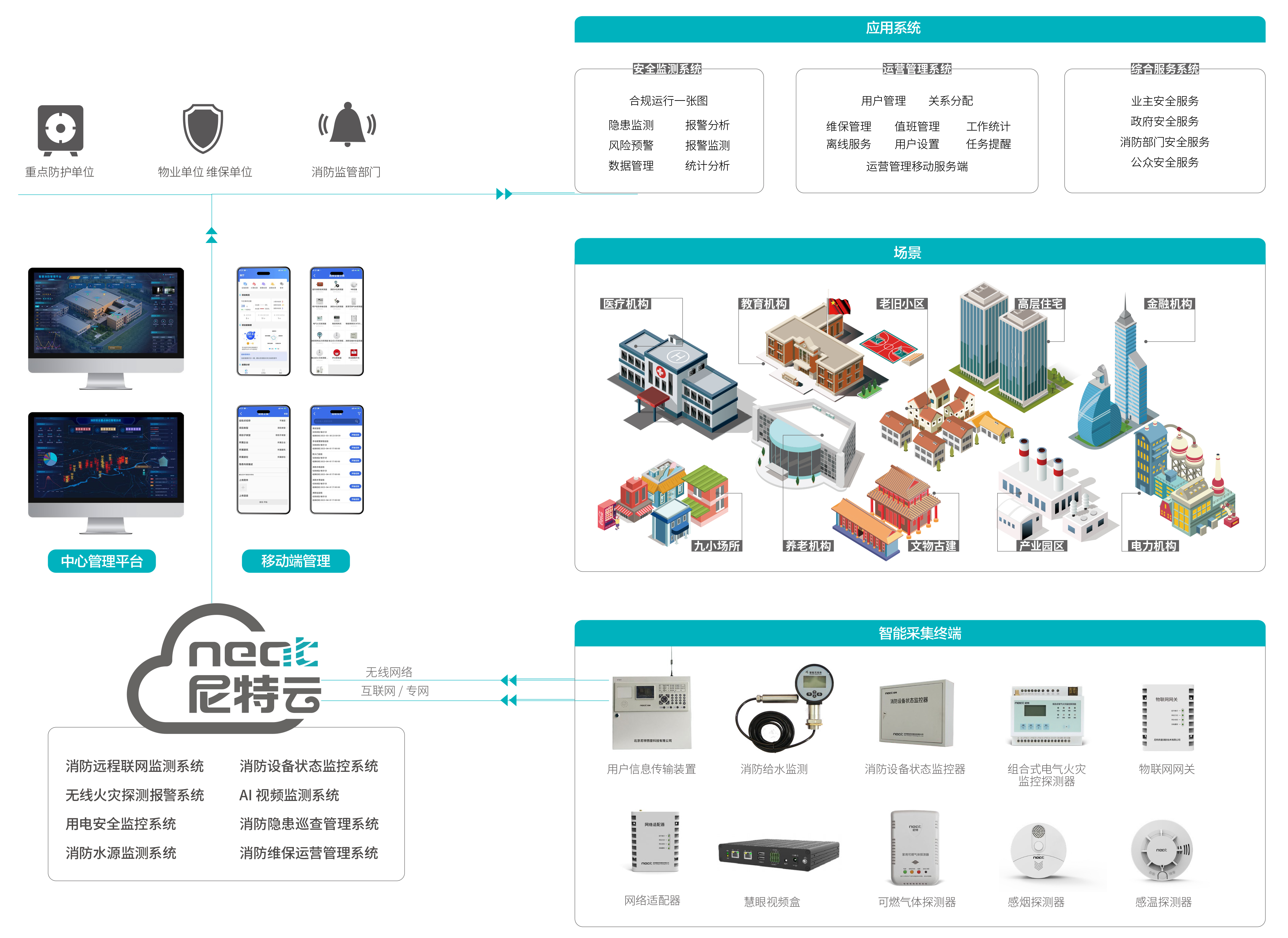尼特云智慧消防管理平臺聚集智慧園區(qū)、智慧物業(yè)、智能建筑等典型場景,提供包括消防IOT管理平消防APP、警情處理、工單系統(tǒng)、智能巡檢、智能維保、大數(shù)據(jù)等-系列云服務(wù)組打造全面智慧消防解決方案,為客戶提供本地化部署、SaaS、 PaaS等多種項(xiàng)實(shí)施方案,助力合作伙伴快速提升消防信息化、智能化管理能力。