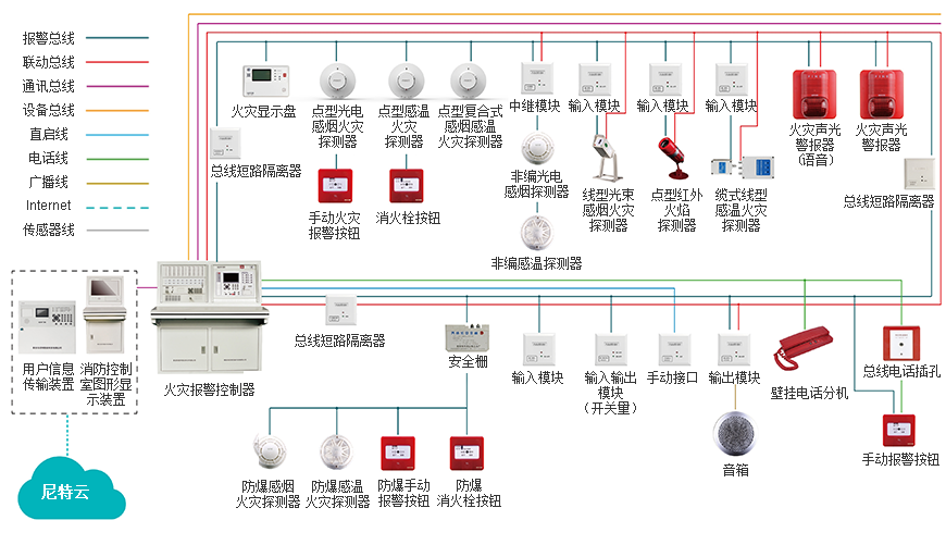 “二線制”解決方案完整,可提供包括火警探測(cè)、聲光警報(bào)、有源脈沖 / 電平的控制輸出在內(nèi)的各類 產(chǎn)品,超低運(yùn)行功耗處于業(yè)內(nèi)領(lǐng)先水平。系統(tǒng)以 NT8001 火災(zāi)報(bào)警控制器和 NT9011 消防控制室圖形顯示 裝置為核心,采用全數(shù)字量總線傳輸,通過“動(dòng)態(tài)采樣和斜率補(bǔ)償”技術(shù),增強(qiáng)系統(tǒng)遠(yuǎn)距離傳輸?shù)姆€(wěn)定 性。系統(tǒng)采用標(biāo)準(zhǔn) CAN 總線通信協(xié)議,可通過用戶信息傳輸裝置與“尼特云”智慧消防平臺(tái)相連。圖形顯 示裝置兼容標(biāo)準(zhǔn) RS232/RS485 通訊接口,可實(shí)現(xiàn)與消防一體化系統(tǒng)和“尼特云”智慧消防平臺(tái)的連接。 系統(tǒng)采用多種自測(cè)試、自診斷技術(shù),具有構(gòu)成完整、節(jié)約成本、運(yùn)行可靠的特點(diǎn)。