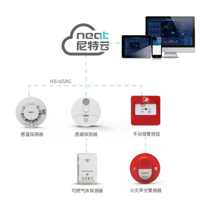 尼特?zé)o線火災(zāi)探測報(bào)警系統(tǒng)利用物聯(lián)網(wǎng)、云計(jì)算、大數(shù)據(jù)等技術(shù),實(shí)現(xiàn)針對各種“小微場所”的全程監(jiān)控,該系統(tǒng)前端感知設(shè)備探測各類信息,通過NB\433\LoRa等無線物聯(lián)網(wǎng)技術(shù)把探測信息實(shí)時(shí)傳回到云平臺,通過云計(jì)算、數(shù)據(jù)存儲、數(shù)據(jù)挖掘、數(shù)據(jù)分析后呈現(xiàn)火警報(bào)警數(shù)據(jù)分析報(bào)表,以便于早期發(fā)現(xiàn)和通報(bào)火災(zāi),及時(shí)采取有效措施控制和撲滅火災(zāi),避免和減少火災(zāi)損失,保護(hù)人民生命財(cái)產(chǎn)安全,降低火災(zāi)風(fēng)險(xiǎn)。