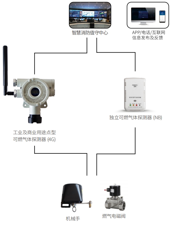 以獨立可燃氣體探測器作為監(jiān)測終端,運用物聯(lián)網(wǎng)、多維地理信息、大數(shù)據(jù)等技術(shù)手段感知、集成分析場景內(nèi)燃氣運行系統(tǒng)的各項關(guān)鍵信息,并將監(jiān)測信息實時上傳至尼特云智慧消防管理平臺,實現(xiàn)“不間斷監(jiān)測、燃氣異常使用預警、秒級現(xiàn)場預警、多智能端協(xié)同接收并處理預警信息、智能切斷燃起閥門、消防應(yīng)急急救部門秒級聯(lián)動”等功能,通過對燃氣管網(wǎng)各個關(guān)鍵業(yè)務(wù)環(huán)節(jié)的信息化管理,實現(xiàn)燃氣安全管控的智能化和精細化。