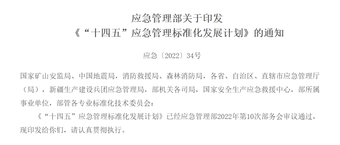 應急管理標準化是新時期應急管理戰(zhàn)略性、引領性、基礎性工作,是推進應急管理體系和能力現(xiàn)代化的重要戰(zhàn)略舉措。為深入貫徹落實《國家標準化發(fā)展綱要》和《“十四五”國家應急體系規(guī)劃》,進一步加強“十四五”應急管理標準化體系建設,持續(xù)提升應急管理標準化水平,制定本計劃。