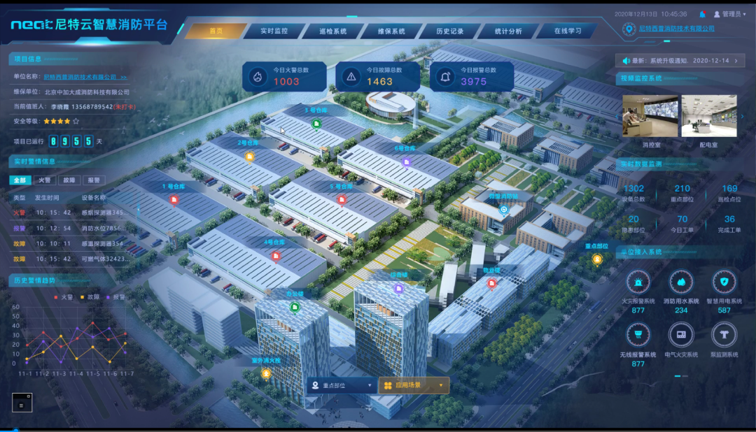 利用用戶信息傳輸裝置實(shí)現(xiàn)園區(qū)火災(zāi)自動(dòng)報(bào)警系統(tǒng)的遠(yuǎn)程聯(lián)網(wǎng),并將園區(qū)內(nèi)所有消防監(jiān)控信息上傳至尼特云智慧消防平臺(tái),利用多種信息感知手段實(shí)現(xiàn)對(duì)園區(qū)消防安全狀況的全方位感知、全過程監(jiān)控,全面提升園區(qū)消防安全管理水平。