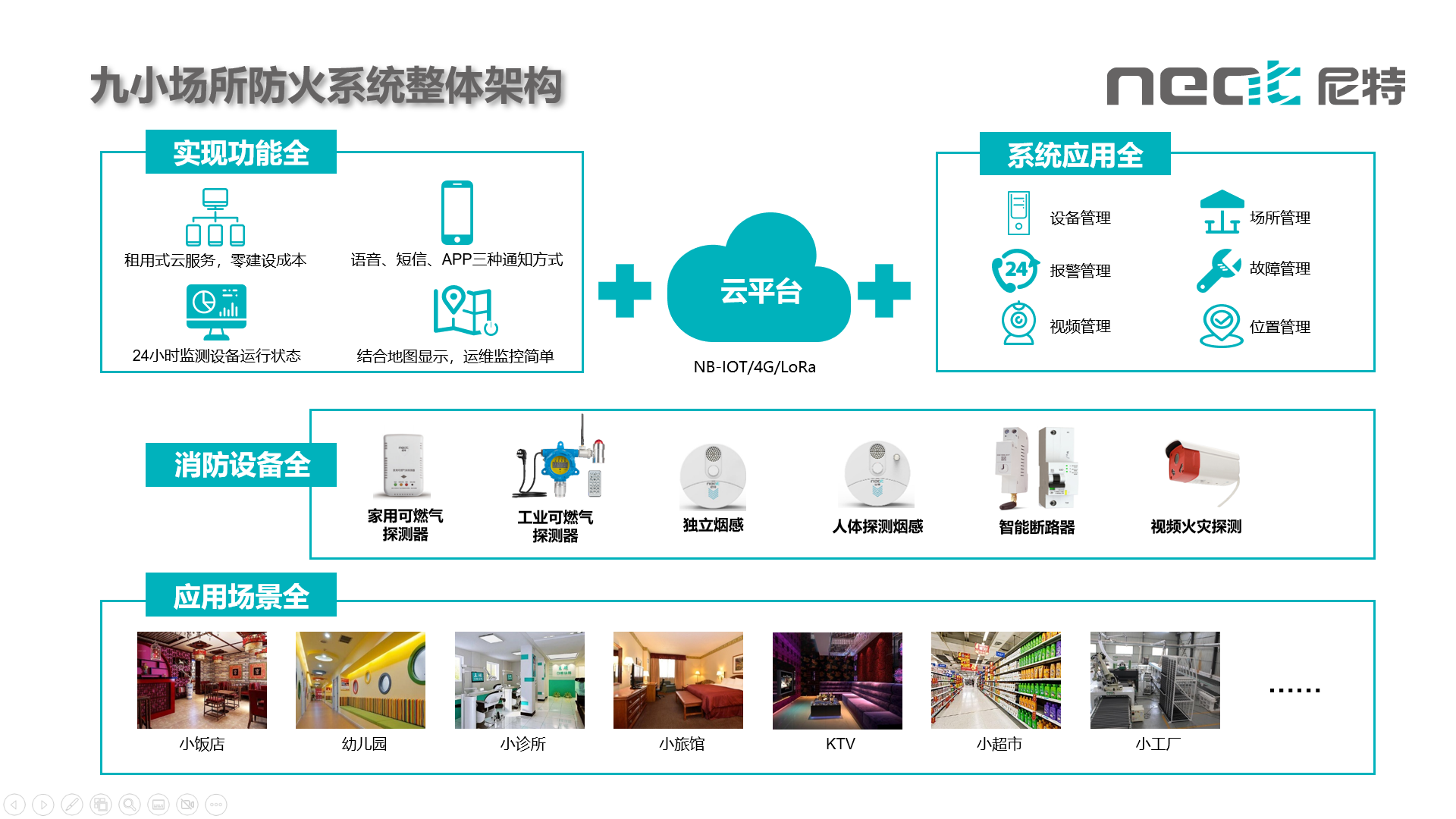 為破解“九小場所”的火災(zāi)預(yù)警和監(jiān)管難題,尼特運(yùn)用物聯(lián)網(wǎng)核心技術(shù),推出九小場所智慧消防解決方案,通過獨(dú)立式感煙火災(zāi)探測器、獨(dú)立可燃?xì)怏w探測器、智能斷路器等前端感知設(shè)備實(shí)時(shí)監(jiān)測火警情況,發(fā)生異常情況,第一時(shí)間將數(shù)據(jù)實(shí)時(shí)傳輸至尼特云智慧消防平臺,并通過語音電話、短信、小尼平安APP推送等多種方式及時(shí)通知給用戶可第一時(shí)間現(xiàn)場復(fù)核,相關(guān)監(jiān)管部門同步聯(lián)動復(fù)核,進(jìn)一步實(shí)現(xiàn)火情的早發(fā)現(xiàn)、早處理。