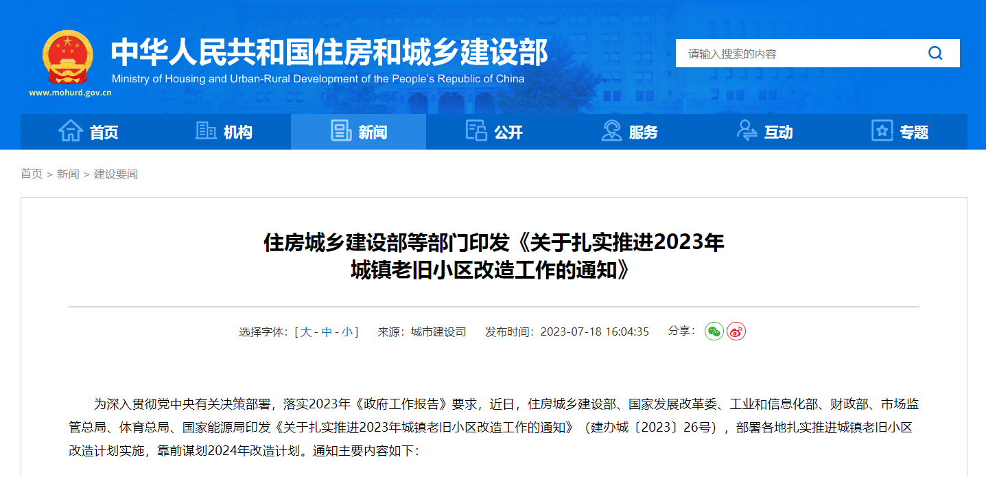 在住房和城鄉(xiāng)建設(shè)部、國家發(fā)展改革委等七部門聯(lián)合印發(fā)《關(guān)于扎實推進(jìn)2023年城鎮(zhèn)老舊小區(qū)改造工作的通知》中也曾明確指出部署各地扎實推進(jìn)城鎮(zhèn)老舊小區(qū)改造計劃實施。