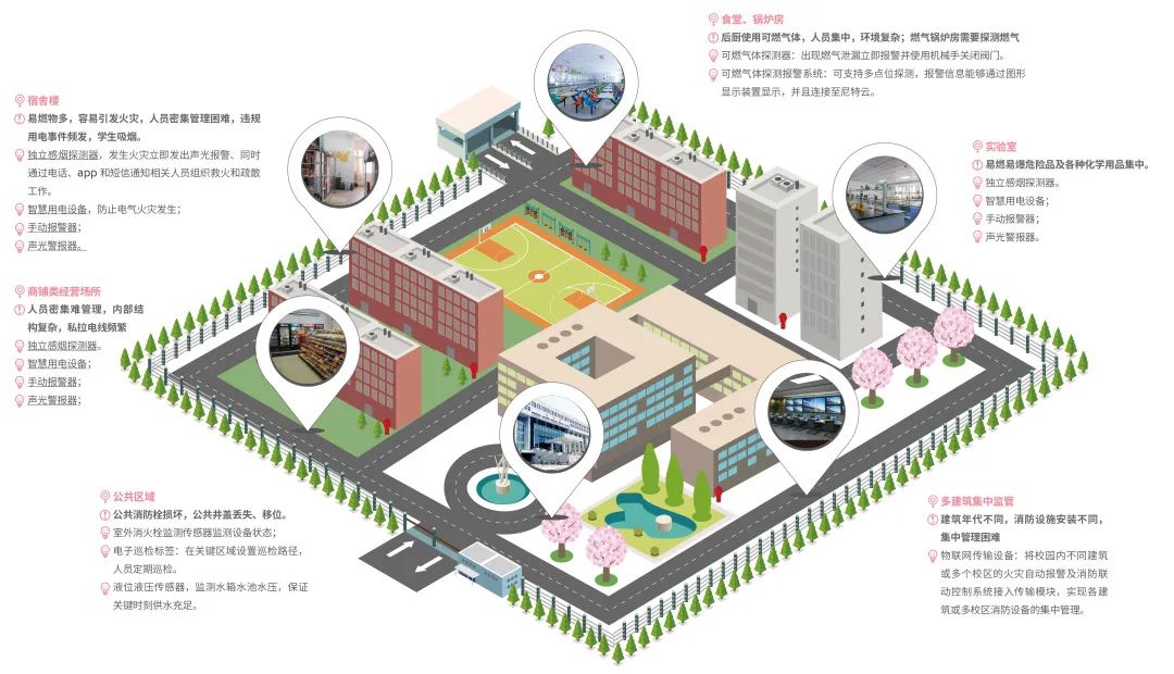 校園作為重點(diǎn)防火單位,火災(zāi)預(yù)警技術(shù)正在火災(zāi)防控中發(fā)揮日益重要的作用。在國(guó)家政策的號(hào)召下,提高學(xué)校的消防安全管控能力、消防隱患發(fā)現(xiàn)以及處置能力、應(yīng)對(duì)火災(zāi)突發(fā)事件的處置效率,防止和減少高?;馂?zāi)的危害,保護(hù)高校人身和財(cái)產(chǎn)安全,全面提升高校消防工作的數(shù)字化、聯(lián)網(wǎng)化、智能化水平,是高校安消管理的重要工作之一。