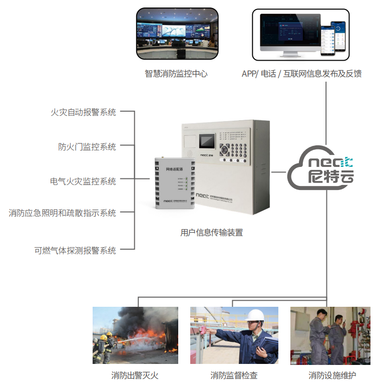 國(guó)網(wǎng)供電消防設(shè)備五花八門、協(xié)議標(biāo)準(zhǔn)各有不同。尼特用戶信息傳輸裝置支持RS232、RS485、CAN等接口,將國(guó)網(wǎng)供電原有的火災(zāi)自動(dòng)報(bào)警系統(tǒng)與智慧消防系統(tǒng)進(jìn)行對(duì)接,實(shí)時(shí)采集各種火災(zāi)報(bào)警、建筑消防設(shè)施運(yùn)行狀態(tài),并在液晶屏上顯示的壓力、水位、控制柜狀態(tài)、消防電源狀態(tài)等信息,以AC220V加備電的供電形式以保證數(shù)據(jù)的穩(wěn)定傳輸,借助多種信息感知手段實(shí)現(xiàn)對(duì)國(guó)網(wǎng)供電消防安全狀況的全方位感知、全過程監(jiān)控。