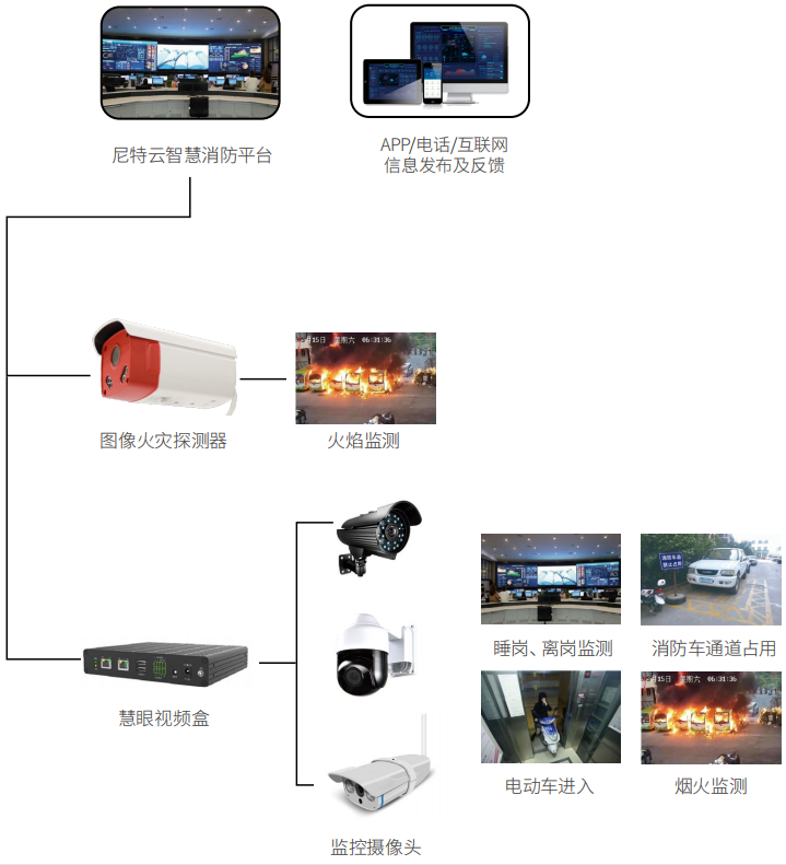 針對(duì)室內(nèi)消防逃生通道、室外消防車道廣泛存在的堵塞和占有的情況,尼特結(jié)合視頻AI技術(shù),對(duì)于國(guó)網(wǎng)供電需要加強(qiáng)火災(zāi)防控的重要部位,以慧眼視頻盒智能監(jiān)管建筑內(nèi)新增或原有的視頻監(jiān)控,發(fā)生火災(zāi)時(shí)聯(lián)動(dòng)展現(xiàn)報(bào)警點(diǎn)視頻,實(shí)現(xiàn)火點(diǎn)檢測(cè)、煙霧識(shí)別、逃生通道物品堵塞、消防通道車輛占用、電動(dòng)車違規(guī)充電或停放、消控室人員在離崗、消控室人員持證上崗等智能監(jiān)測(cè)應(yīng)用,實(shí)現(xiàn)國(guó)網(wǎng)供電的消防一體化管理。