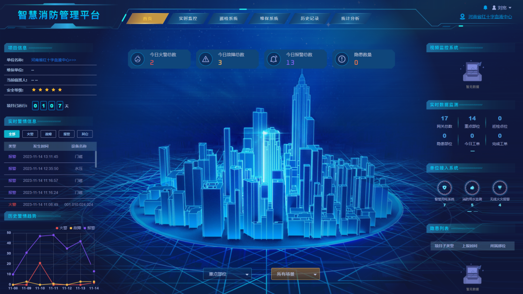 對報警信息進行統(tǒng)計,生成周報、月報、季度報和年報,建立設(shè)備的信息化管理流程,將管理日志、運行日志、巡查日志生成電子檔案,實現(xiàn)血液中心消防管理工作的痕跡化。