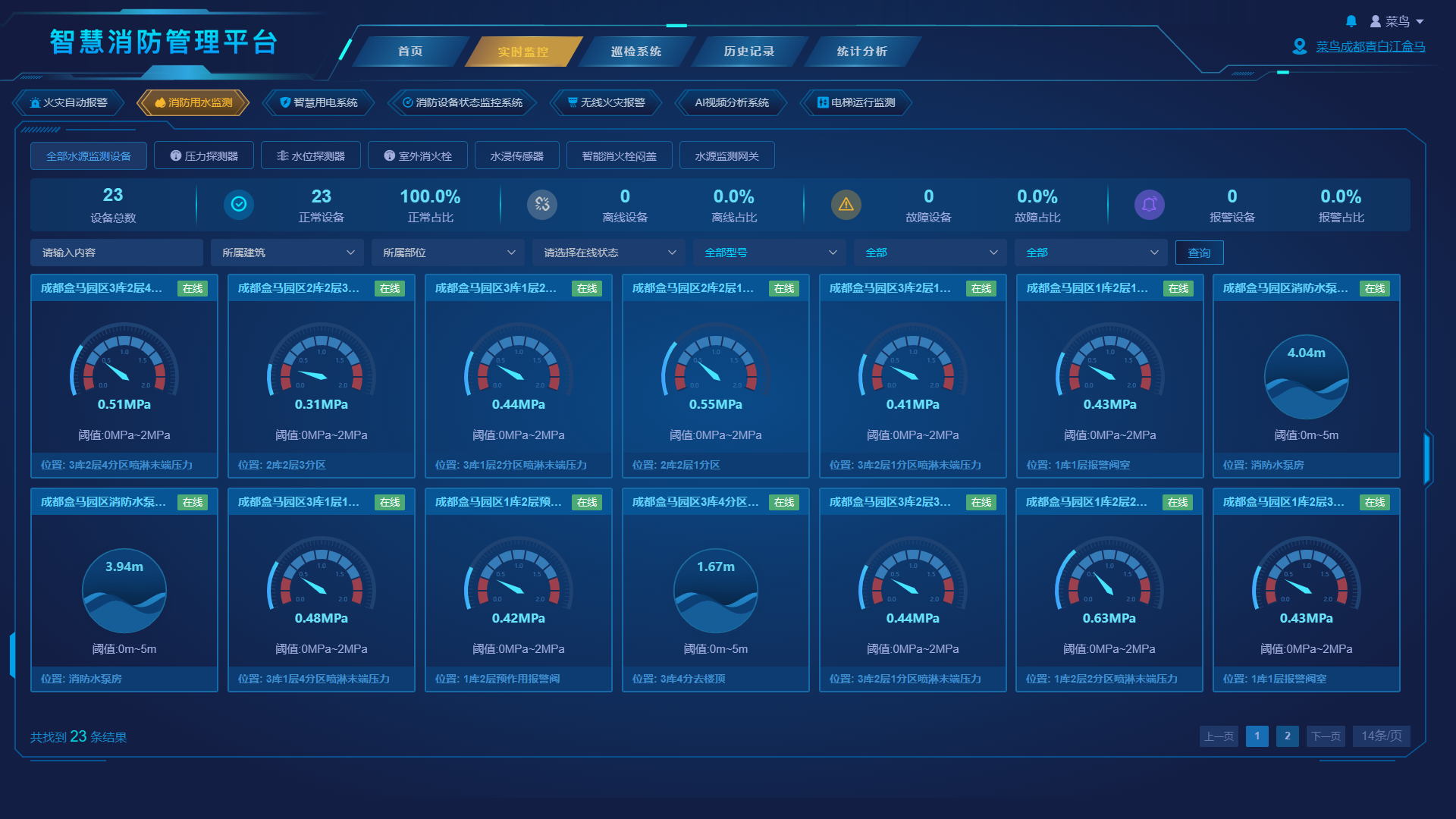 菜鳥全國園區(qū)消防設(shè)備品牌眾多、聯(lián)網(wǎng)協(xié)議標(biāo)準(zhǔn)各不相同,結(jié)合菜鳥智能化監(jiān)管需求,尼特通過用戶信息傳輸裝置將各園區(qū)原有的火災(zāi)自動報警系統(tǒng)與智慧消防系統(tǒng)進(jìn)行對接,實(shí)時采集各種火災(zāi)報警、建筑消防設(shè)施運(yùn)行狀態(tài),并利用消防管網(wǎng)壓力探測器、消防水位探測器,對各園區(qū)消防給水系統(tǒng)進(jìn)行了多點(diǎn)并發(fā)監(jiān)測和動態(tài)分析,發(fā)生異常時能夠及時發(fā)出報警信息,在尼特云智慧消防管理平臺上將所有預(yù)警、報警信息進(jìn)行統(tǒng)一收集、管理,以電話語音、短信、APP推送等多種形式通知至菜鳥平臺及各園區(qū)相關(guān)部門,實(shí)現(xiàn)了全國園區(qū)消防一體化管理。