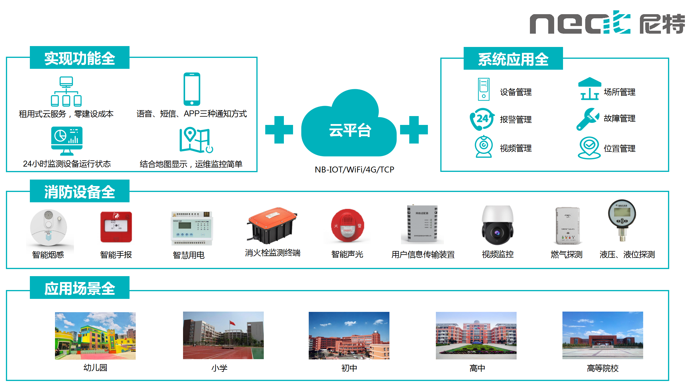 通過接入尼特云智慧消防管理平臺、布設智能硬件終端,實現(xiàn)集中監(jiān)控、在線監(jiān)測、點對點維護,有效提升中小學、幼兒園的消防管理水平。