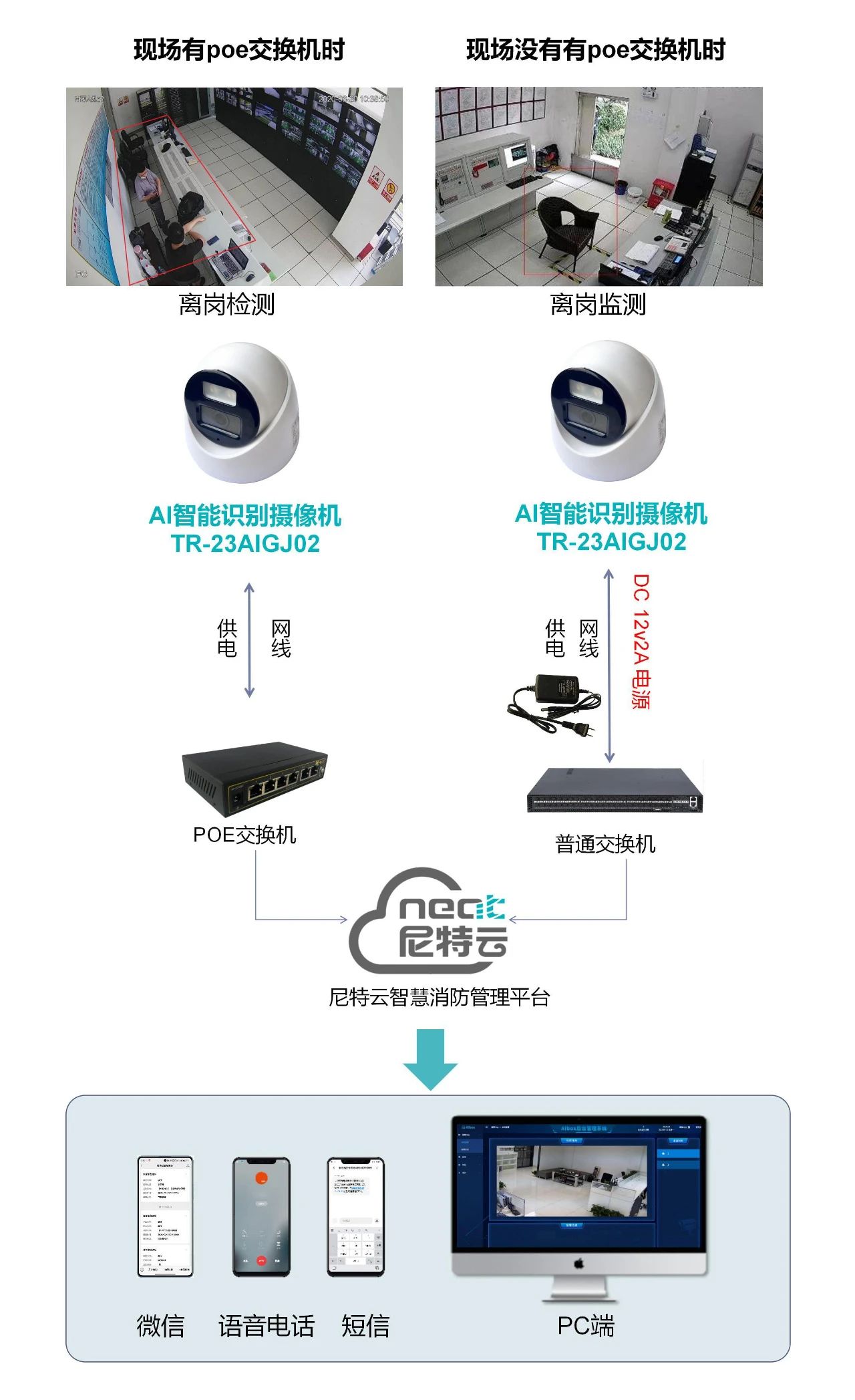 當(dāng)現(xiàn)場(chǎng)未安裝攝像頭時(shí),可以通過安裝AI智能識(shí)別攝像機(jī)進(jìn)行離崗識(shí)別,現(xiàn)場(chǎng)工作人員擅自離崗超過預(yù)設(shè)時(shí)間,會(huì)立即通過尼特云智慧消防管理平臺(tái),以語音、電話、短信等形式向責(zé)任單位安全負(fù)責(zé)人發(fā)出人員離崗告警信息,提醒單位負(fù)責(zé)人及時(shí)予以糾正、處理。