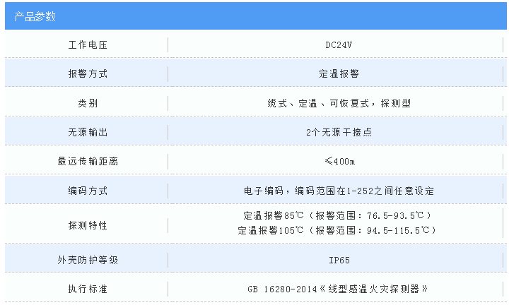 根據(jù)不同的場合,不同額定動作溫度的探測需求,產品分為JTW-LD-NT8119/85纜式線型感溫火災探測器與JTW-LD-NT8119/105纜式線型感溫火災探測器兩種,探測溫度分別為85℃、105℃兩個級別,最大長度400m,標準報警長度1m,適用于大宗場所需求。