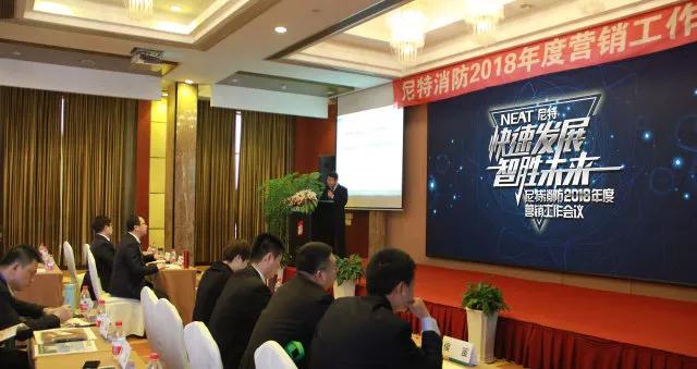 會(huì)議開始,由尼特消防市場(chǎng)營(yíng)銷總監(jiān)做《2017-2018年度市場(chǎng)營(yíng)銷工作報(bào)告》,全面總結(jié)了公司2017年的產(chǎn)品研發(fā)、生
