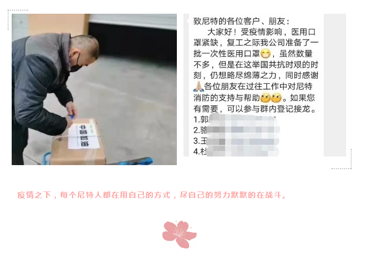 許多渠道負(fù)責(zé)人捐贈(zèng)的留言都是“武漢加油!尼特加油!中國(guó)加油!”,在此刻,“加油!”是我們最能夠表達(dá)心聲的言語(yǔ)。尼特君與身在武漢渠道負(fù)責(zé)人張總溝通得知,雖然他每三天才能下一次樓,但在采購(gòu)生活必需品的路上,總能透過(guò)消毒水感受到春天的味道。大家在群里討論的復(fù)工事項(xiàng),總讓他更加期待疫情結(jié)束,能夠盡快開展工作。沒(méi)有了最開始的慌張,大家都已經(jīng)習(xí)慣認(rèn)真的帶著口罩,勤洗手、少出門、適度鍛煉,為復(fù)工做好身體和心理的準(zhǔn)備,在交卷鈴聲響起前,能做的就是認(rèn)真做好每一道題。