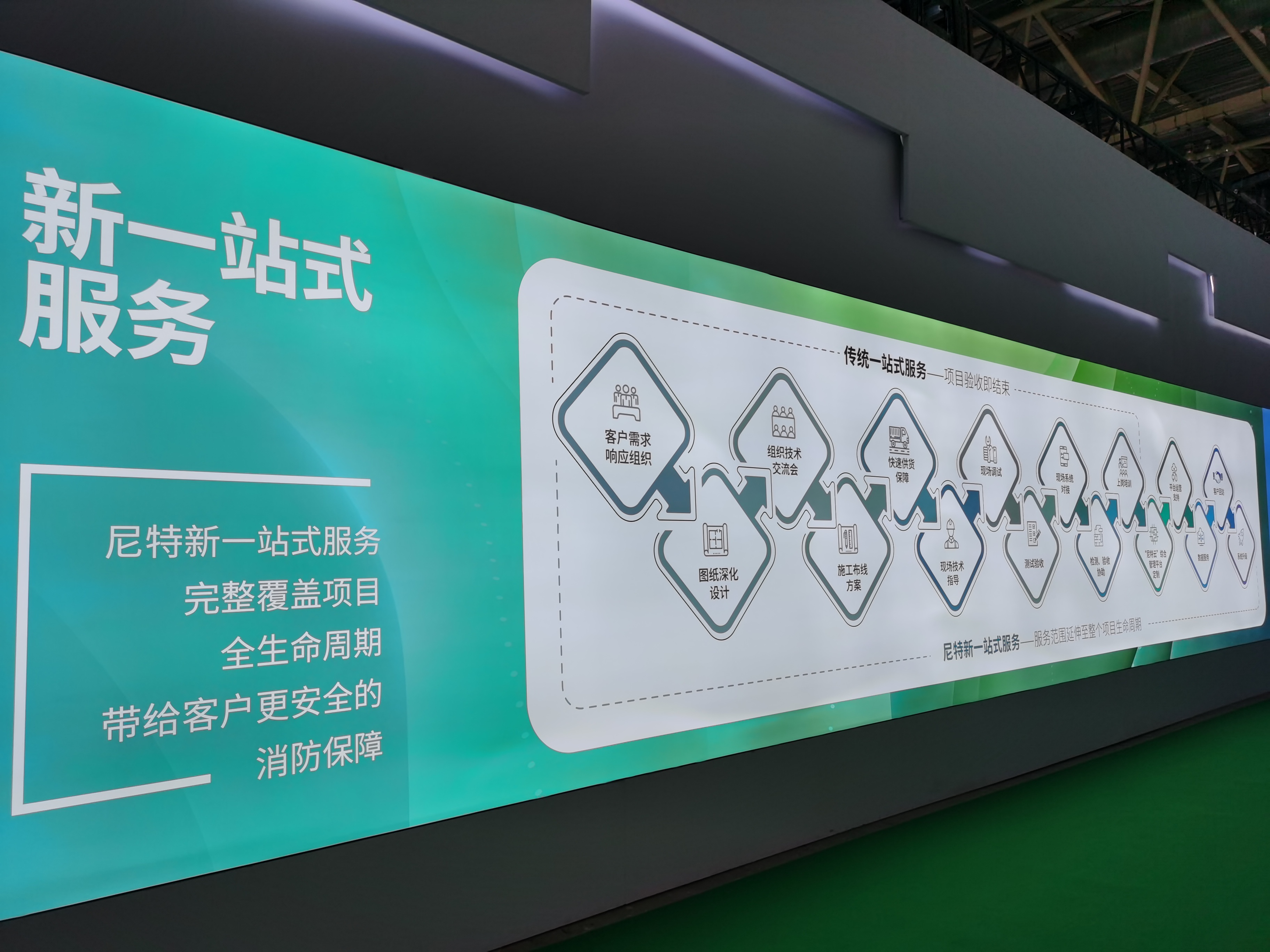展會現(xiàn)場,尼特用25米電子幕布墻全面展示了在物聯(lián)網(wǎng)消防新定位下的兩大服務(wù)特色:“新一站式”和“全面定制化”。不同于其他品牌的是,尼特的服務(wù)特色是基于自身系統(tǒng)的完整性優(yōu)勢和服務(wù)覆蓋優(yōu)勢建立的。對比傳統(tǒng)一站式服務(wù),尼特新一站式服務(wù)不僅涵蓋了傳統(tǒng)消防技術(shù)服務(wù)的全過程,更以云平臺為載體,完善了項目交付后期對設(shè)備和項目的監(jiān)管及運營,將服務(wù)鏈延伸至項目整個生命周期,極大地保障了項目的安全性。同時,全面定制化的服務(wù)模式也更好地提升了客戶合作體驗,帶給現(xiàn)場用戶不小的價值反響。