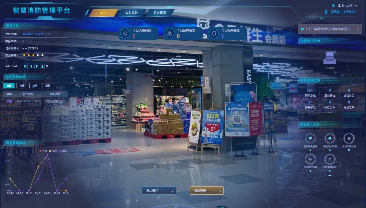 基于盒馬鮮生(新天店)對電氣火災防控有較高的管理需求,尼特為盒馬鮮生定制了用電安全監(jiān)測系統(tǒng)和消防水源監(jiān)測系統(tǒng),利用尼特云智慧消防平臺進行集中監(jiān)管,確保了盒馬鮮生店鋪內對用電設備的安全保護和消防用水的正常使用,提高了消防應急預警能力。