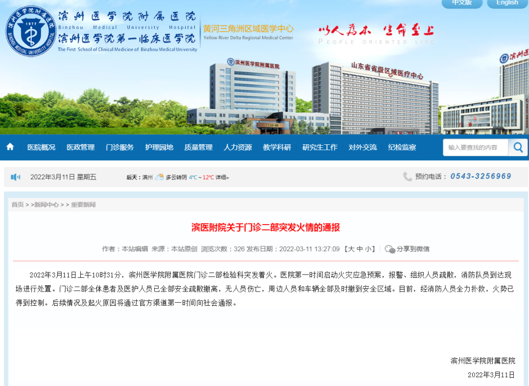 2022年3月11日上午10時31分,濱州醫(yī)學院附屬醫(yī)院門診二部檢驗科突發(fā)著火,根據(jù)醫(yī)院的通報,火災發(fā)生后,醫(yī)院第一時間啟動火災應急預案,消防救援人員到達現(xiàn)場進行處置,無人員傷亡,目前火災事故發(fā)生的具體原因仍在調查中。