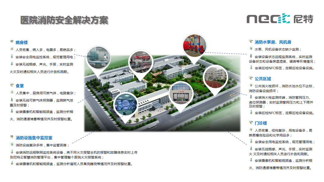 醫(yī)院屬于消防重點防護單位,人員相對集中,病人多且行動不便,醫(yī)院里的儀器、化學試劑、被褥等易燃易爆品,都易成為醫(yī)院火災的“導火索”,因此,保護醫(yī)院消防安全,尤為重要,尼特智慧消防解決方案從根源協(xié)助醫(yī)院預防火災發(fā)生,保障醫(yī)院消防安全。