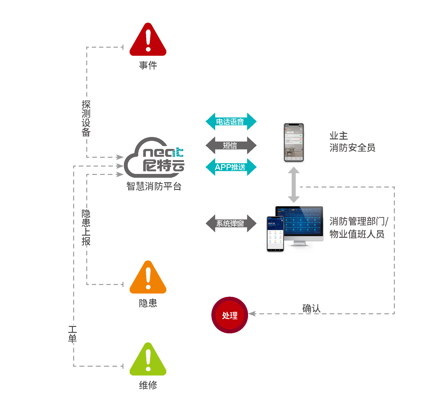 通過物聯(lián)網(wǎng)技術(shù)實(shí)時采集聯(lián)網(wǎng)單位消防系統(tǒng)前端感知設(shè)備的報警信息和設(shè)備運(yùn)行狀態(tài)信息,將所有消防監(jiān)控信息通過用戶傳輸裝置上傳至尼特云智慧消防平臺,為行業(yè)消防安全提供火災(zāi)初期預(yù)警、用電故障預(yù)警、消防水源監(jiān)測、火災(zāi)報警遠(yuǎn)程通知等多維度的防火監(jiān)控,實(shí)時收集消防報警設(shè)備信息及消防檢查數(shù)據(jù),實(shí)現(xiàn)一體化聯(lián)網(wǎng)。