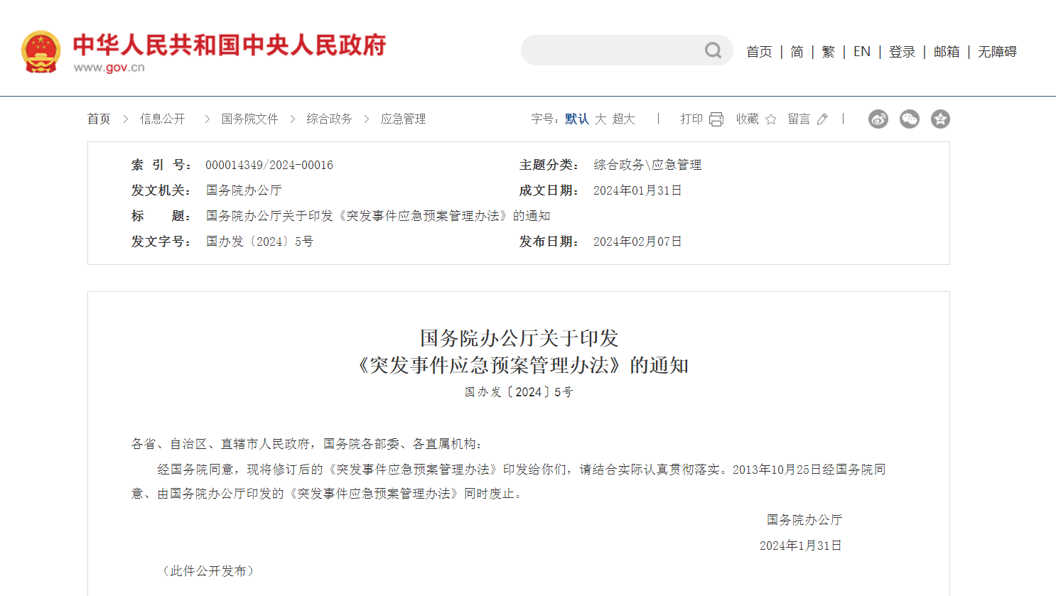 日前,國務(wù)院辦公廳印發(fā)修訂后的《突發(fā)事件應(yīng)急預(yù)案管理辦法》(以下簡稱《辦法》)?!掇k法》共8章43條,圍繞增強應(yīng)急預(yù)案的針對性、實用性和可操作性,結(jié)合國家應(yīng)急管理體制改革情況,主要...