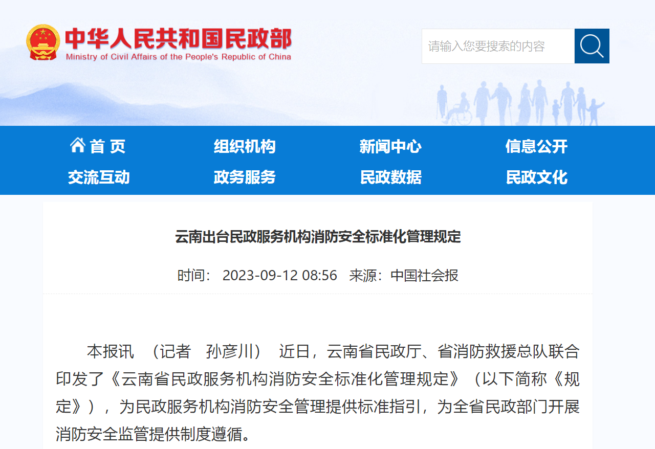 近日,云南省民政廳云南省消防救援總隊聯(lián)合印發(fā)《云南省民政服務(wù)機(jī)構(gòu)消防安全標(biāo)準(zhǔn)化管理規(guī)定》。 其中第十一條明確: 民政服務(wù)機(jī)構(gòu)應(yīng)當(dāng)按照國家、行業(yè)標(biāo)準(zhǔn)配置消防設(shè)施、器材...