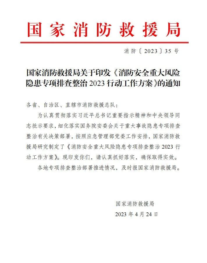 國家消防救援局關于印發(fā) 《消防安全重大風險隱患專項排查整治2023行動工作方案》 的通知 ? 4月24日,國家消防救援局印發(fā)工...